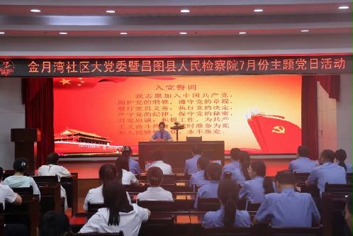 本次党日活动由昌图县人民检察院机关党委专职副书记王继伟主持,金月湾社区大党委近百名党员参加。活动现场,举办了新党员入党宣誓和老党员重温入党誓词活动。第一支部副书记黄冬雪、第四支部副书记勾冰同志为两名新党员佩戴党徽。昌图县人民检察院驻所检察室主任、金月湾社区第一书记宋铖同志领誓,全体党员共同高举右手,再次庄严宣誓。“我志愿加入中国共产党……随时准备为党和人民牺牲一切,永不叛党。”金月湾社区大党委书记李佰春同志为过政治生日的3名党员代表颁发生日贺卡。昌图县人民检察院分管党务工作的党组成员、副检察长李宇,宣布了县直机关工委关于调整昌图县人民检察院机关党委部分成员的决定。金月湾社区副书记刘阳带领大家就习近平总书记近日对党的建设和组织工作作出的重要指示开展学习。县住建局李冠英同志,围绕“健全全面从严治党体系”相关内容同大家开展交流学习。县卫健委赵丽平同志,带领大家一起学习《中国共产党机构编制工作条例》相关内容。县科协于万利同志,带领大家一起研学习近平法治思想相关内容。金月湾社区大党委副书记、昌图县人民检察院党组成员、政治部主任、易志学同志以“深刻领悟习近平新时代中国特色社会主义思想的重大意义”为题为讲授专题党课。